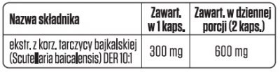 Składniki: ekstrakt z korzenia tarczycy bajkalskiej (Scutellaria baicalensis) DER 10:1, składnik kapsułki (żelatyna – składnik otoczki)